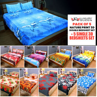 Pack of 5 Nature Print Double Bed Sheets Set with 5 Single Bed Sheets Set