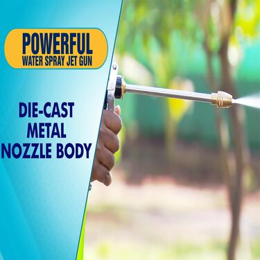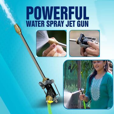 This is a high pressure metal jet water gun. It is Portable hence easy to carry and easy to operate as well. The metal and Brass material makes it durable and is also anti rust. It comes in a gun shaped design that develops good water flow if the tap pressure is good. It is ergonomically-shaped & has a soft vinyl grip for a comfortable hold too. Hands free lock provides relief for long time use as it helps to reduce hand fatigue. It fits all standard home hoses. It also has a 360 degree rotating nozzle