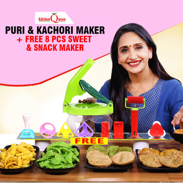 Unveiling the Kitchen Queen Puri & Kachori Maker - a versatile kitchen essential. Crafted from durable, unbreakable plastic, this non-electric roti maker simplifies the preparation of round Puri & Kachori with its 5-inch diameter and anti-skid heavy base. Enjoy smooth operation with the convenient handle and receive 8 free roller cutters for creating a variety of snacks. The 3-in-1 roller cutter adds versatility with three different shapes, while the square, heart, triangle, and round-shaped cutters offer options for preparing various stuffed sweets and snacks. Elevate your festive cooking at home, avoid outside food, and embrace a unique and stylish approach to culinary delights during celebrations.