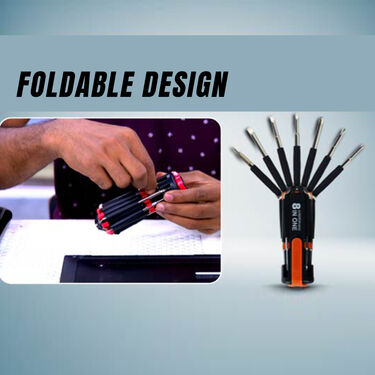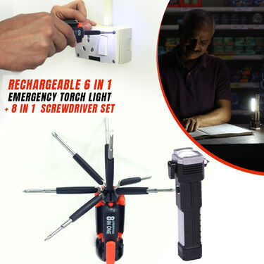 Introducing the versatile 6 in 1 Rechargeable Emergency Torch Light paired with an 8 in 1 Screwdriver set. This product is designed for every situation. "Shine Bright in Any Situation" with features like a long-distance beam, USB power bank, and 8-in-1 screwdriver set. Its foldable design and multifunctional capabilities make it perfect for emergencies, repairs, or daily use.