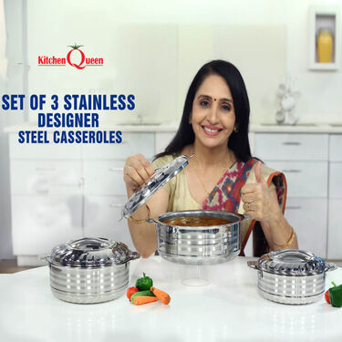 Designed to keep your food warm and fresh, Set of 3 Stainless Steel Casserole is a must-have addition to your kitchen accessories. Made from 100% BPA Free, it is safe to use and does not affect health in a negative way. Each piece of the set is durable and scratch-resistant. It keeps food hot for upto 4-5 hours. It is easy to clean and ideal for gifting as well. Available in attractive colours and an eye-catchy design, the casserole set will definitely enhance your kitchen decor/dining table instantly.