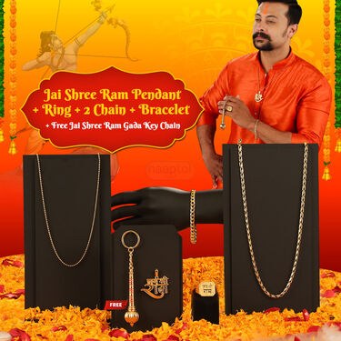 Elevate your style with our Shree Ram jewelry set, featuring a pendant, ring, bracelet, and two chains exquisitely crafted with a golden finish. Each piece is meticulously designed to embody the divine essence of Shree Ram, adorned with intricate details and Austrian diamond embellishments. The pendant and ring showcase the iconic symbol of Lord Ram, while the bracelet and chains add a touch of sophistication to any outfit. Made for men who appreciate quality craftsmanship and timeless elegance, this set is a symbol of devotion and reverence. Perfect for everyday wear or special occasions, these pieces make a meaningful addition to your collection. With a weightless feel and adjustable features, they offer comfort and versatility. Complete your look with our complimentary Shree Ram Gada Key Chain, a symbol of strength and protection