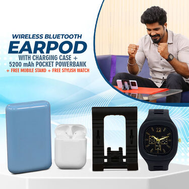ESSENTIALS FOR EVERYONE - Wireless Bluetooth Earpods with Charging Case + 5200 mAh Pocket Powerbank + Free Mobile Stand + Free Stylish Watch (PB10)