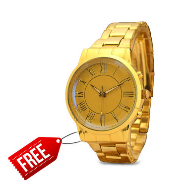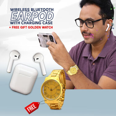 Indulge in the epitome of modern convenience and timeless elegance with this wireless Bluetooth earpod set paired with a sophisticated golden analog watch. Offering a seamless blend of technology and style, these twin earpods deliver HD sound quality, hassle-free connectivity, and a snug fit for an immersive music experience or crystal-clear calls. With a battery life of up to two hours and the ability to charge three times from the case, these earpods provide wireless freedom on the go. Paired with a stunning golden watch, this combo is not just about staying connected but doing so with a touch of enduring sophistication. Whether you're into music, podcasts, or hands-free calls, this set ensures you're wired for seamless functionality and unmatched style